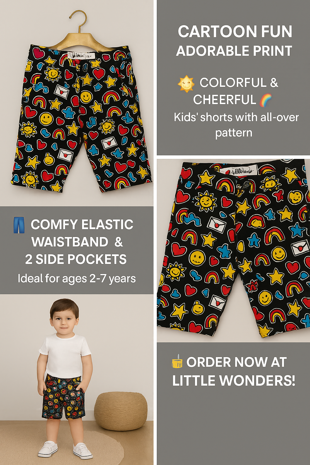 Kids' Fun Emoji Print Cotton Shorts ā Black