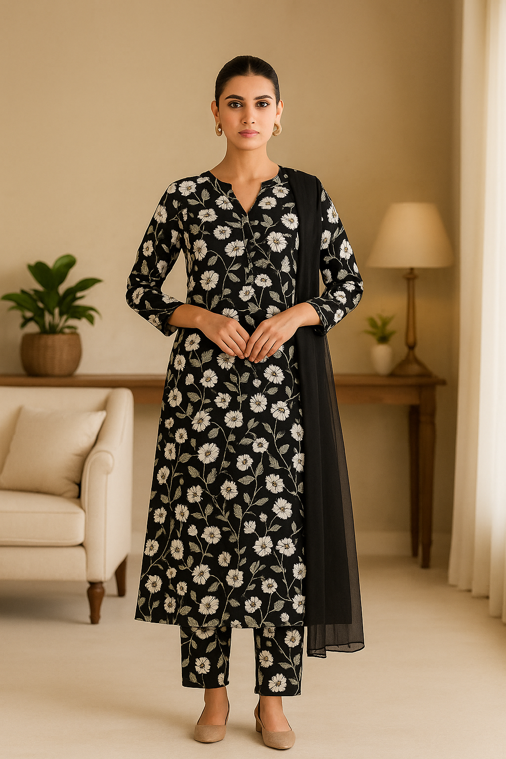 Elevate your everyday elegance with this Noir Bloom 2-piece lawn suit. Featuring a jet-black base adorned with soft white floral prints, the outfit includes an A-line long shirt with a V-neckline and matching straight pants. Designed from breathable lawn fabric for ultimate comfort, this timeless piece is ideal for both casual wear and semi-formal outings.
